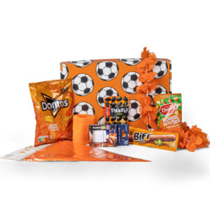 De oranjedoos zit vol met eyecatchers zoals een hawaikrans, oranjebril en fanbrush in rood, wit en blauw. Met de “hup Holland hup” en “jij bent een keepertje” snoepjes krijgt dit WK pakket een speelse en herkenbare twist die meteen zorgt voor een glimlach.